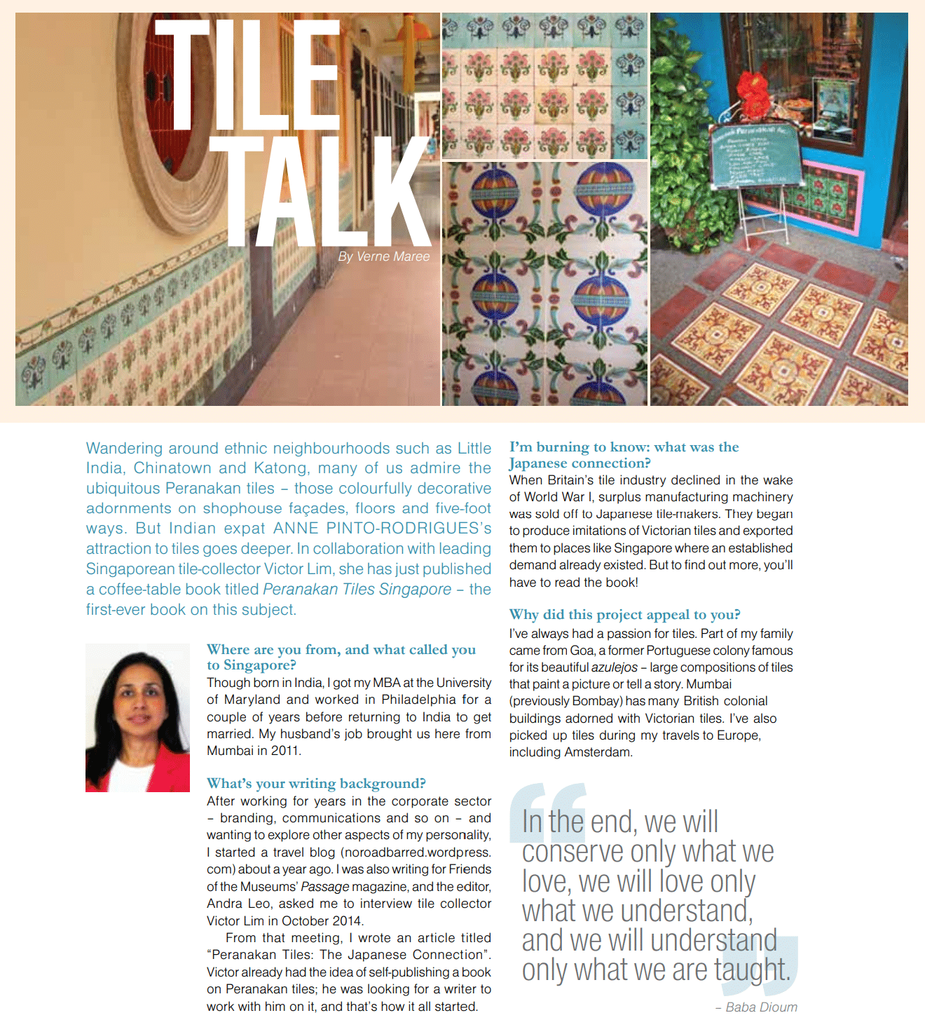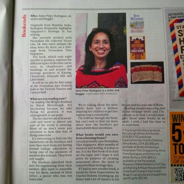 Here are some of Anne’s interviews, talking about the decorative tiles seen in Singapore, and all that went into the making of the book Peranakan Tiles of Singapore in collaboration with one of Singapore’s leading tile collectors.